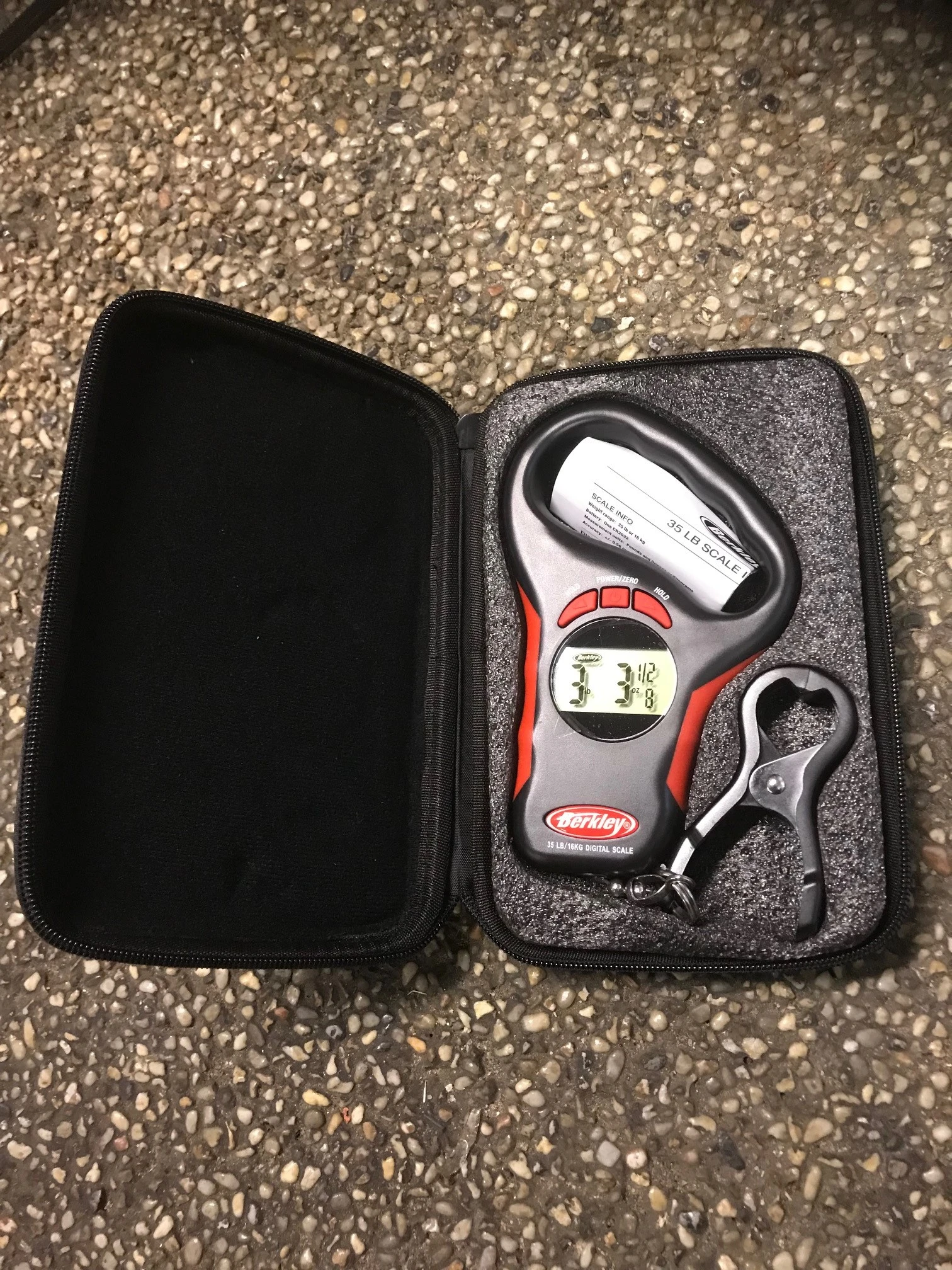 Mycket behändig digitalvåg med rejält handtag, väger upp till 16kg med tydlig display. Godkänd för storfiskregistrering. Batterier och praktisk skyddande fodral ingår.