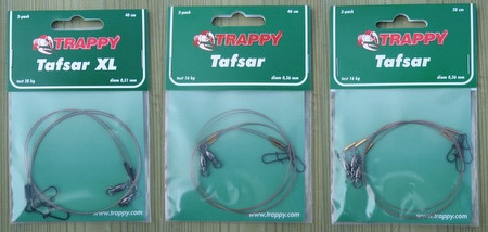 Mycket populära tafsar tillverkade av smidig 19-trådig camofärgad wire. Duo lock beteslås är troligen marknadens starkaste med öppen rund ögla för att ge alla beten bästa möjliga gång. Alla Trappy tafsar har kullagerlekare.