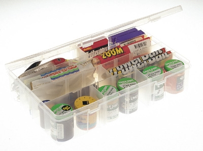 Genomskinlig, rymlig. Justerbart antal fack. Storlek 36x23x8 cm.