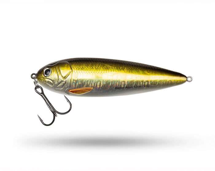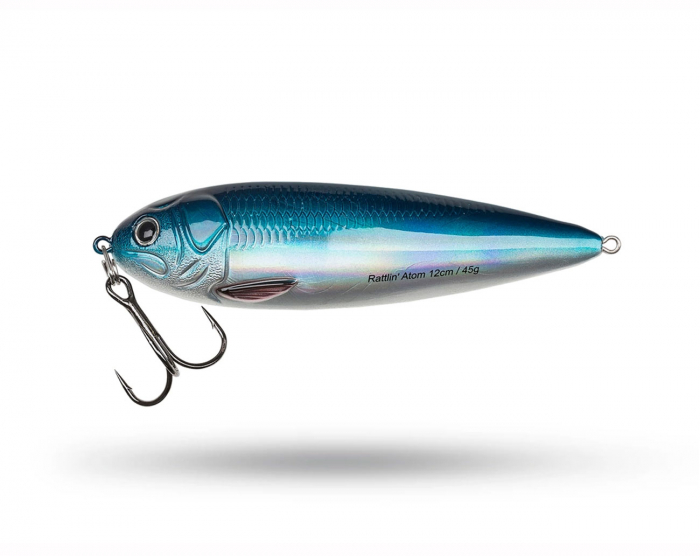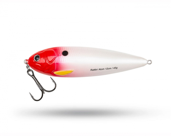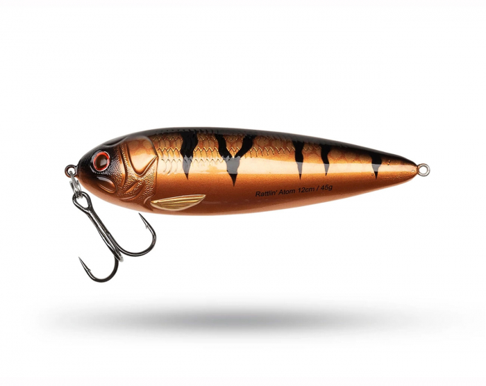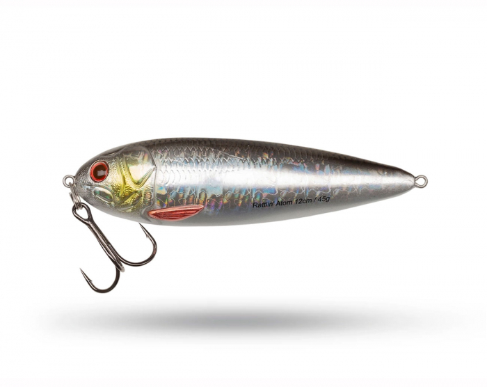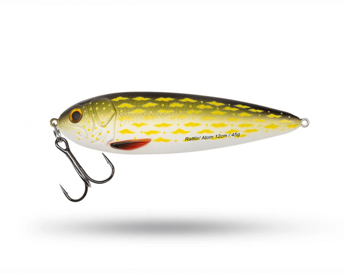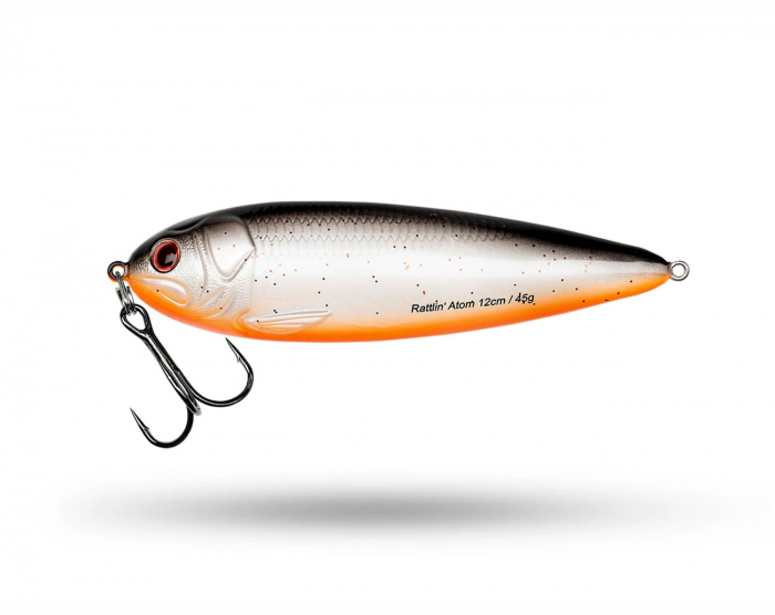 Rattlin Atom 120mm. Hybrid mellan wobbler och skeddrag. Unik gång, kan fiskas på alla djup, grym på gäddan i grunda vikar. Före detta Onduspoon.